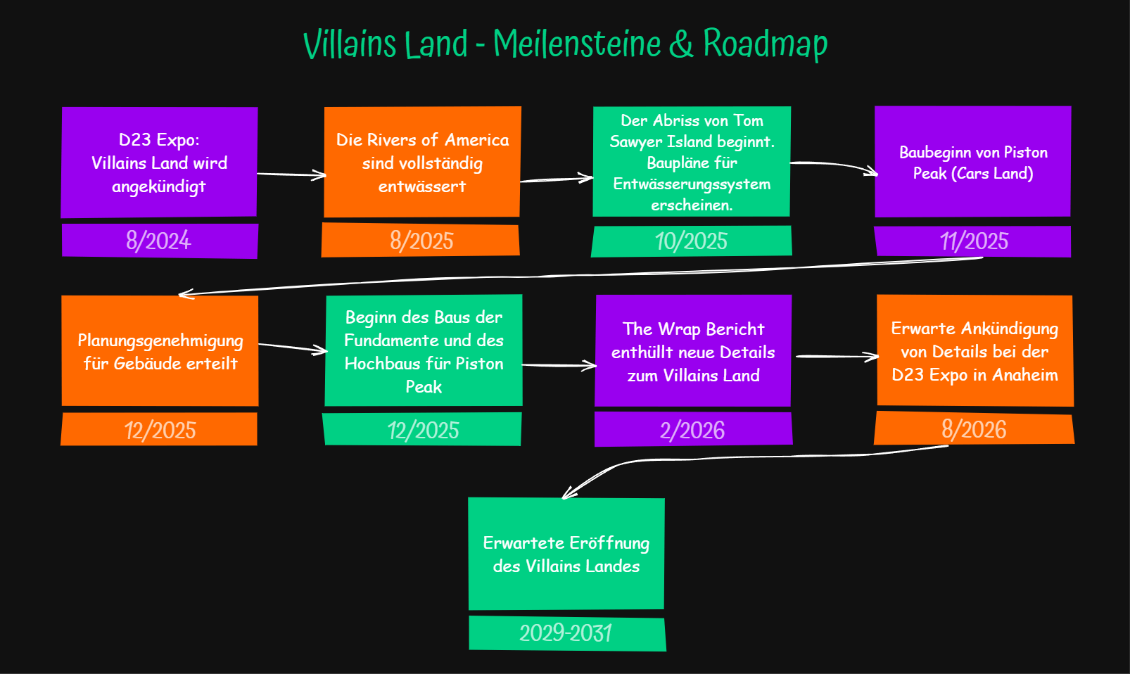 Wir gehen derzeit davon aus, dass Villains Land frühestens 2029 eröffnen wird, 2030 erscheint sogar noch wahrscheinlicher, 2031 ist nicht ausgeschlossen.