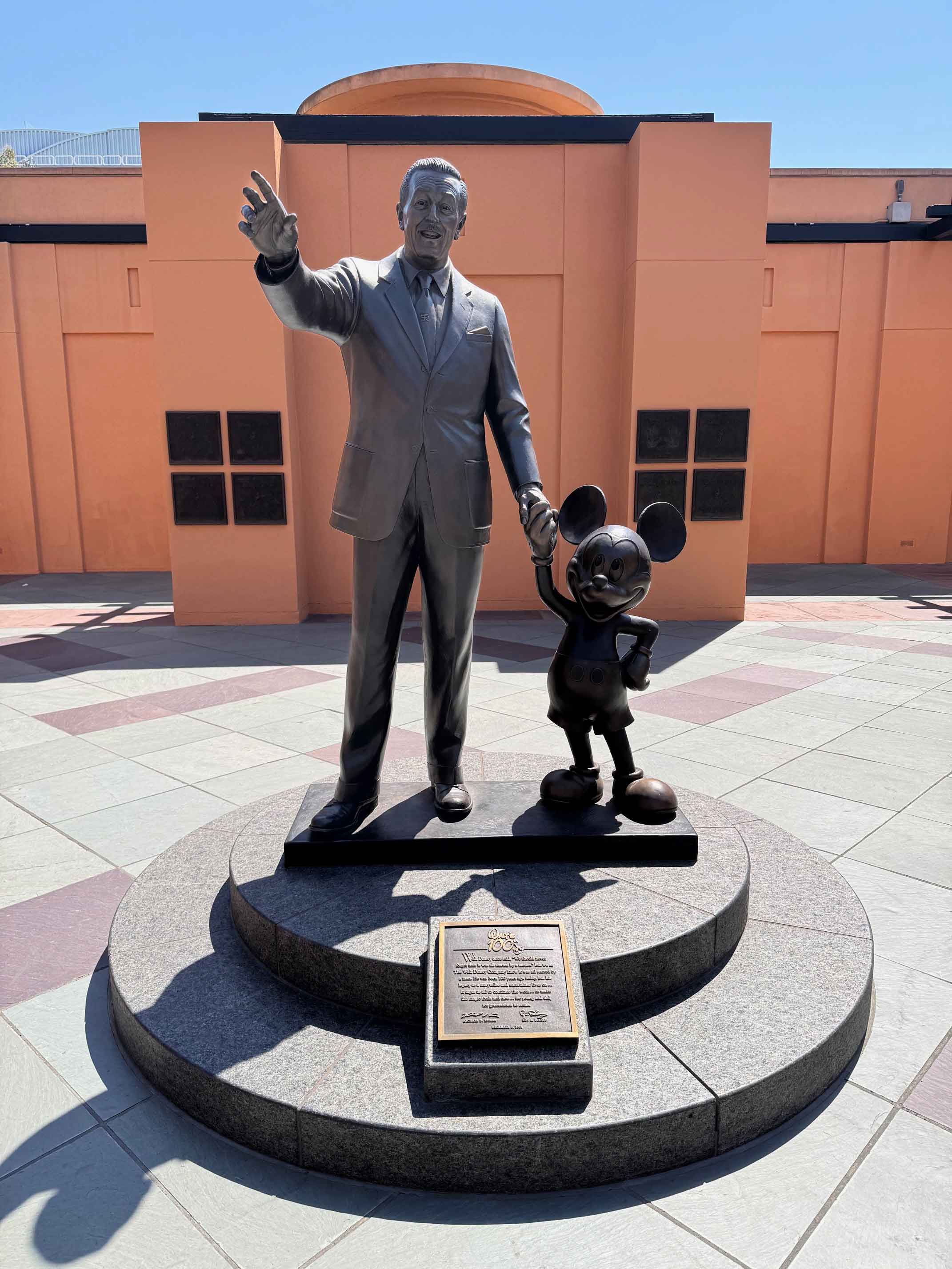 Direkt davor liegt der Disney Legends Plaza, wo bronzene Tafeln die Namen und Handabdrücke jener tragen, die Disney-Geschichte geschrieben haben. In der Mitte begrüßt einen die bekannte Partner Statue, auf der Walt Disney liebevoll Micky Maus an der Hand hält – ein Symbol dafür, dass alles mit einem Traum und einer kleinen Maus begann. Die erste Statue wurde von Disney Legend Blaine Gibson geschaffen und bereits 1992 in Disneyland Anaheim aufgestellt und ist in allen Parks weltweit als Reblika zu sehen. Die letzte Rebplika fand 2003 schlussendlich ihren Weg nach Burbank.