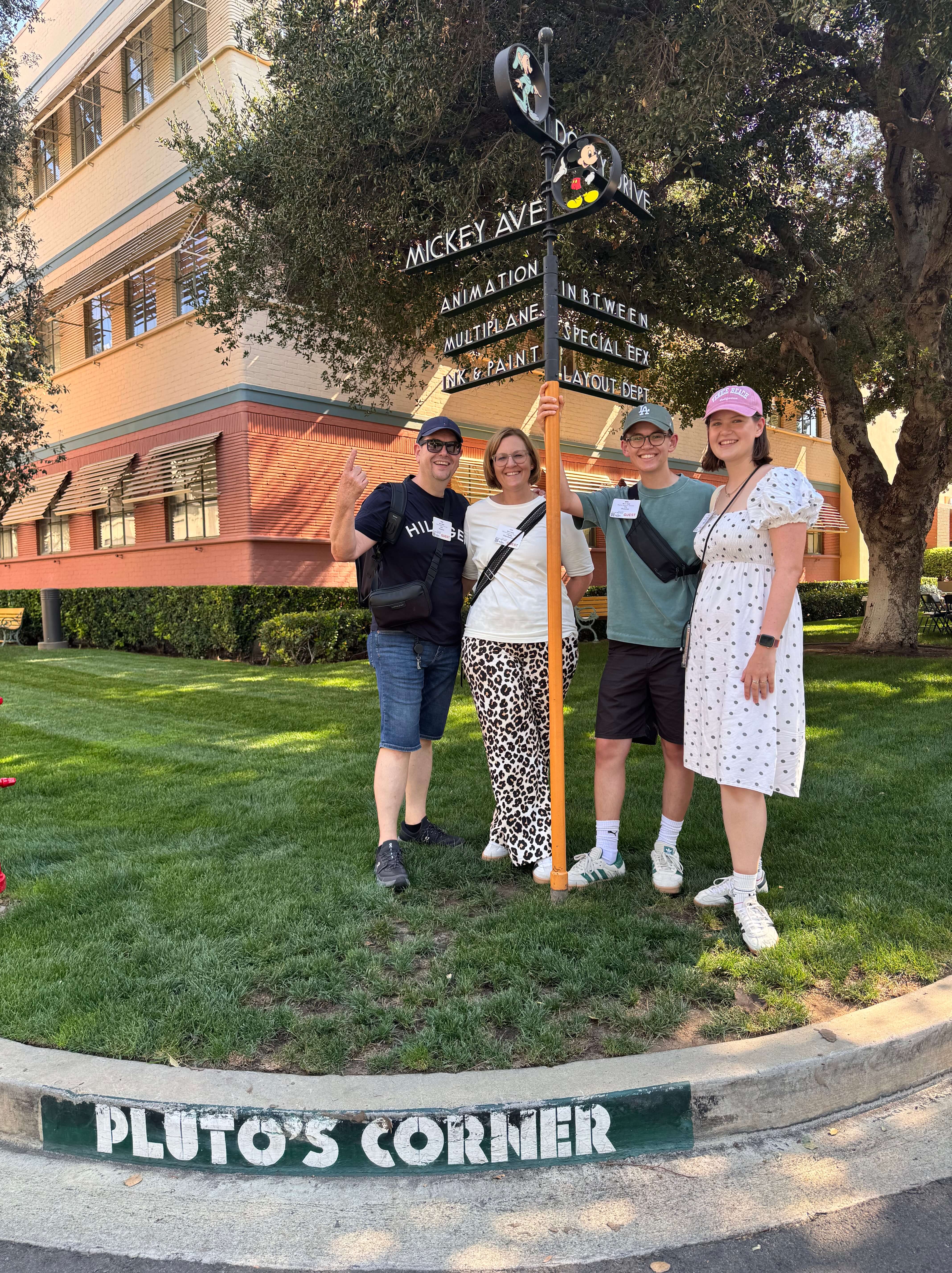 Unser erster Stopp war Pluto’s Corner, eine kleine Kreuzung mitten auf dem Studiogelände. Auf dem Gehweg sieht man drei Pfotenabdrücke und eine Schnauzenspur, als hätte Pluto hier eben noch um die Ecke geschnuppert. Unser Guide erzählte, dass dieser Ort als augenzwinkernde Hommage an Disneys vierbeinigen Freund geschaffen wurde. Perfekt, um den Tag mit einem Lächeln zu beginnen – und für ein schnelles Foto. Auch ist Plutos Corner in der Disney-Produktion “The Reluctant Dragon” von 1941 zu sehen und wurde ursprünglich für den Film geschaffen.