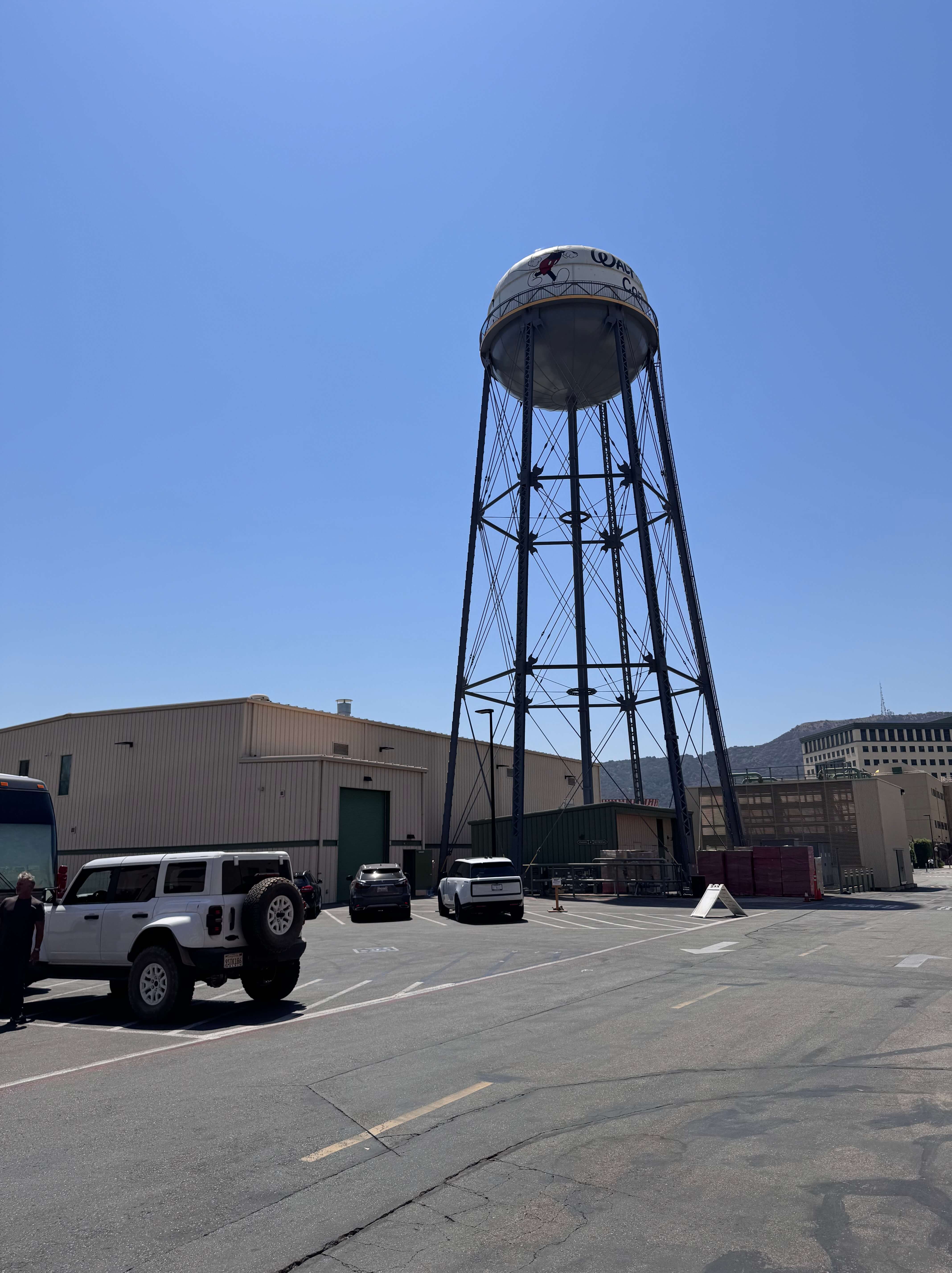 Auf dem Weg zum nächsten Stopp blieb unser Blick am Wasserturm hängen, der majestätisch über dem Gelände thront. Früher diente er als echte Wasserversorgung für den Brandschutz, heute ist er ein Wahrzeichen und Symbol der Studiotradition. Mit dem Disney-Schriftzug auf der weißen Kuppel wirkt er wie ein stiller Beobachter, der seit Jahrzehnten über die Geschichten wacht, die hier zum Leben erweckt werden. Ursprünglich hatte der Tank vier Beine, aber Walt wollte die Ästhetik verbessern und so erfuhr das markante Wahrzeichen der Walt Disney Studios zwischenzeitlich eine Erweiterung. Heute schmücken insgesamt sechs Beine den Wasserturm.