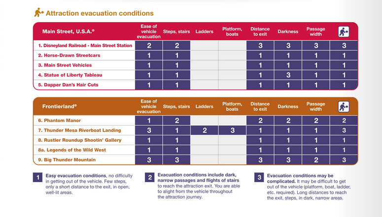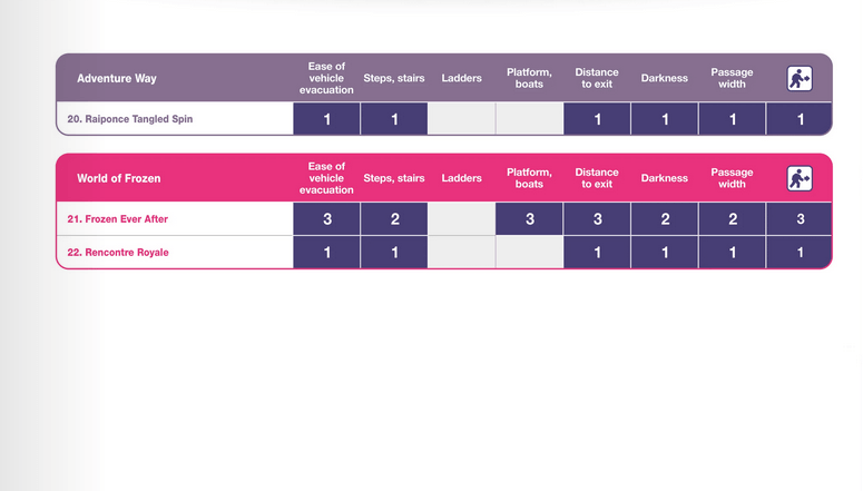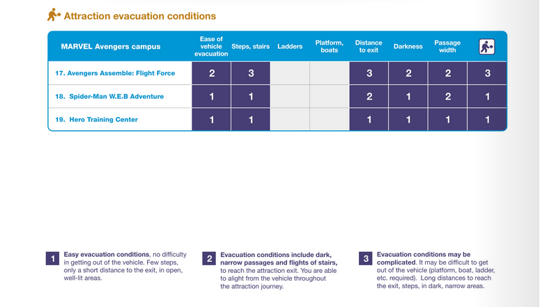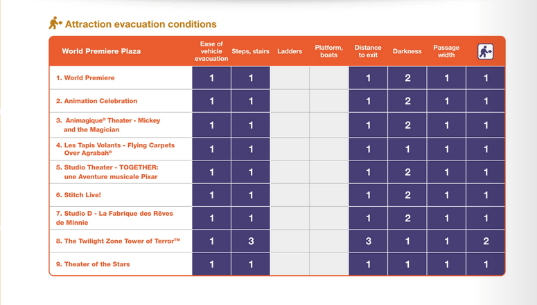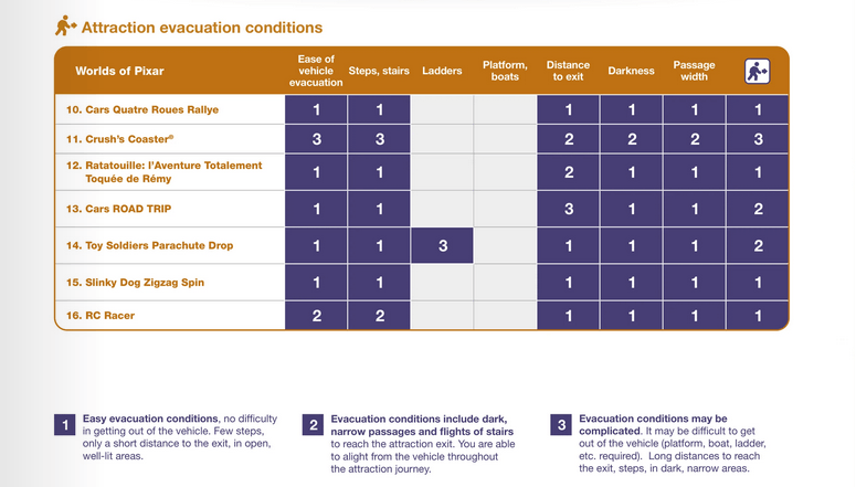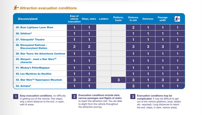 Auch im Falle einer Evakuierung gibt es vorgeschriebene Prozedere, die eingehalten werden müssen. Aus diesem Grund hat Disneyland Paris eine praktische Übersicht erstellt, die Dir schon vor Antritt der Fahrt zeigt, wie leicht oder schwer eine unplanmäßige Evakuierung verlaufen wird. Ist dies nicht möglich, kann auch hier die Fahrt mit der Attraktion verwehrt werden.
