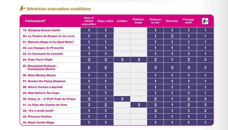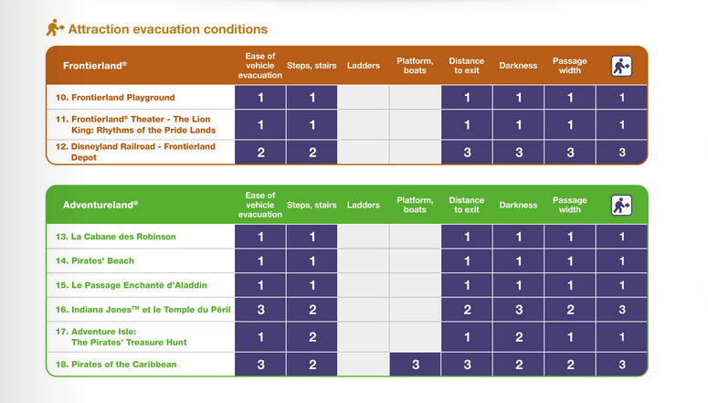In Disneyland Paris werden die Evakuierungsbedingungen für jede Attraktion in verschiedene Kategorien und Schwierigkeitsstufen eingeteilt, aus denen sich eine Gesamtwertung ergibt. Hier findest Du eine Übersicht über die Einstufung aller Attraktionen. Die Zahlen haben folgende Bedeutung: